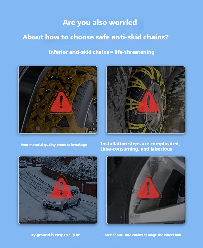1.When snow chains are installed, sudden braking and sharp turns are prohibited. Safety cannot be overlooked!