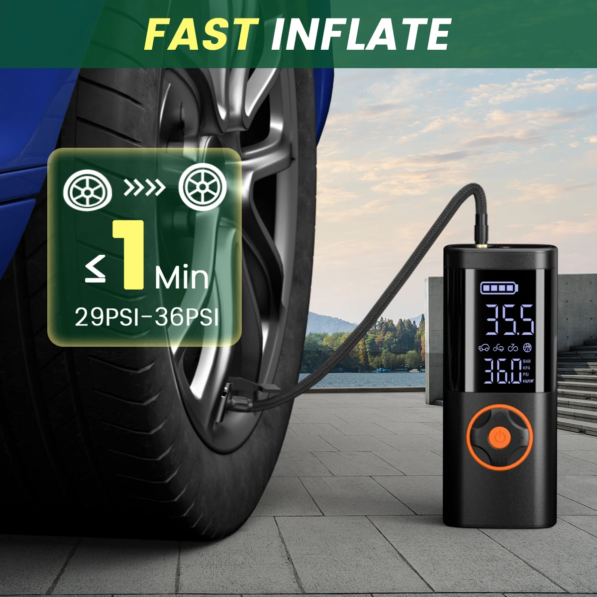Fast Inflation: Inflate a tire (29-36 PSI) in under 1 minute with this portable air compressor, delivering up to 150 PSI for cars, SUVs, bikes, and sports gear.