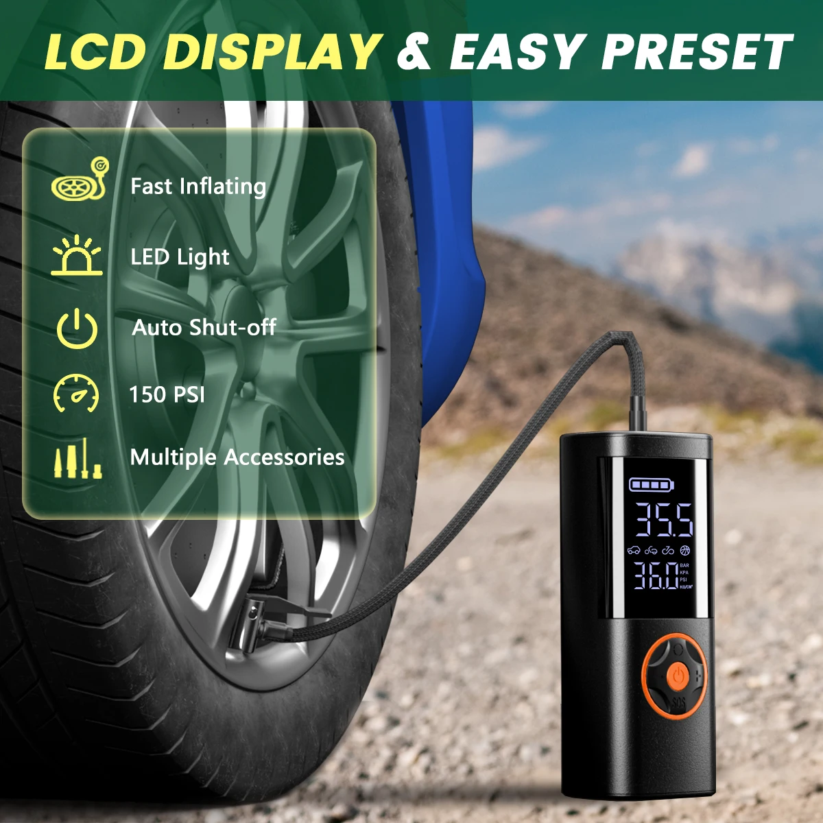 Auto-Stop Feature: Set your target pressure (4-150 PSI) manually or via presets, and the inflator stops automatically at the desired PSI to prevent overinflation.